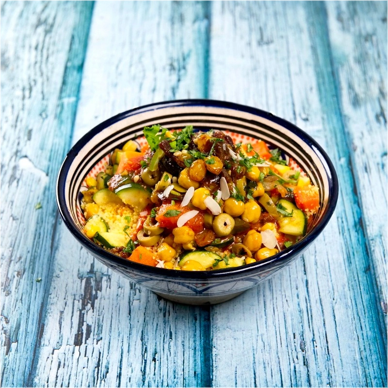 Vegan luchtige, gestoomde couscous met olijven, courgette, kikkererwten, pompoen, witte kool en wortel, aangevuld met gekarameliseerde ui, rozijnen, shakshouka en geurige bouillon. Deze heerlijke combinatie bevat seizoensgebonden groenten, zodat je altijd geniet van verse ingrediënten in al onze gerechten0