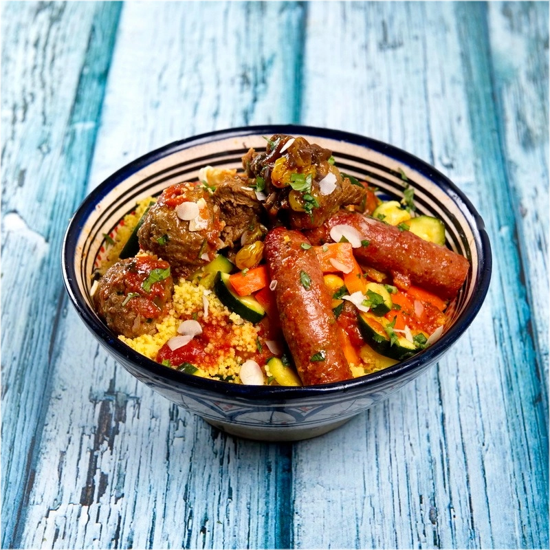Een luchtige, gestoomde couscous, subtiel gekruid, met gegaard rundvlees, merguez en lamsgehakt. Aangevuld met een mix van verse groenten zoals courgette, pompoen, wortel, wittekool en zoete aardappel, plus kikkererwten, gekarameliseerde ui, rozijnen en shakshuka saus, en geurige bouillon. De groenten variëren met de seizoenen0
