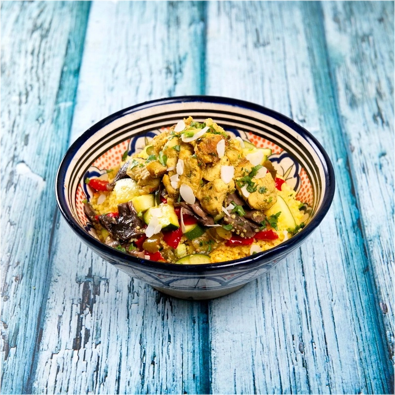 Luchtige, gestoomde couscous, geserveerd met gekruide kipfilet. Daarbij een rijke mix van champignons, gegrilde paprika, diverse verse groenten en een homemade shakshukasaus0